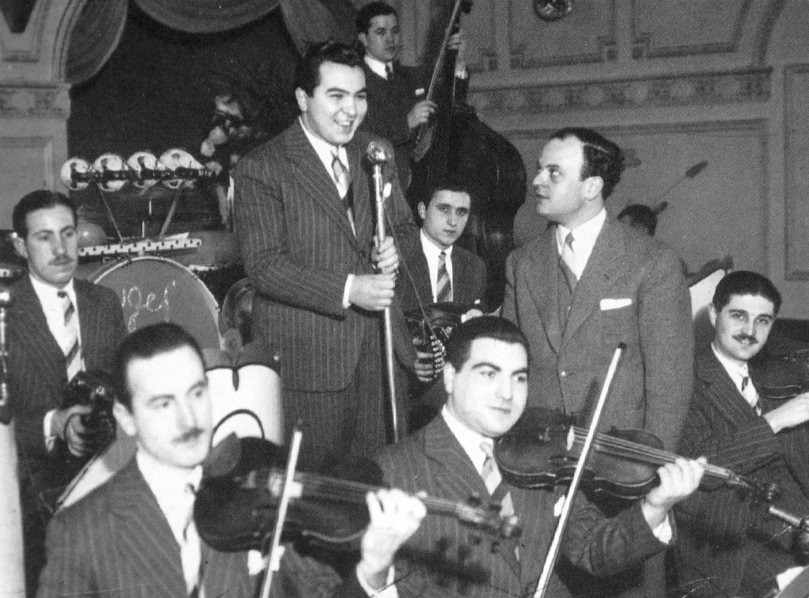 Miguel Caló is looking at singer Alberto Podestá while Enrique Francini plays violin in the foreground